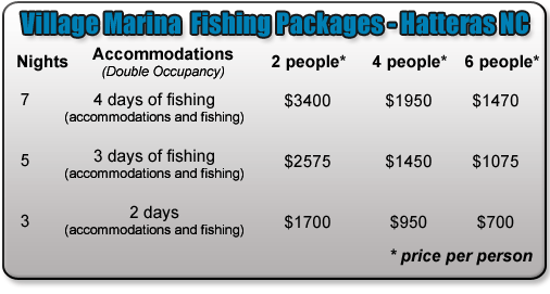 Over Under Sport Fishing offers complete Hatteras Fishing Charter Packages. Sample packages are listed below, and we can create any combination of fishing days, nights, and number of people you like. We specialize in putting together large group outtings, for up to 24 people. If you are organizing your next company fishing trip, a Cape Hatteras Fishing Chater Package would be an excellent choice. We have rooms right at our Marina, within walking distance to the boat, restaurant, and bar.